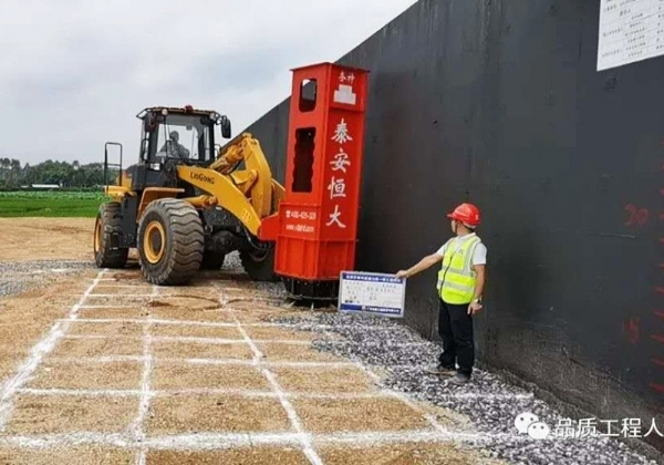 2020年6月11日,信梧一期總監(jiān)辦督促一總包部采用信梧路品質(zhì)工程示范創(chuàng)建主要措施,在涵背回填過(guò)程中采用高速液壓夯實(shí)機(jī)進(jìn)行補(bǔ)強(qiáng)夯實(shí)。